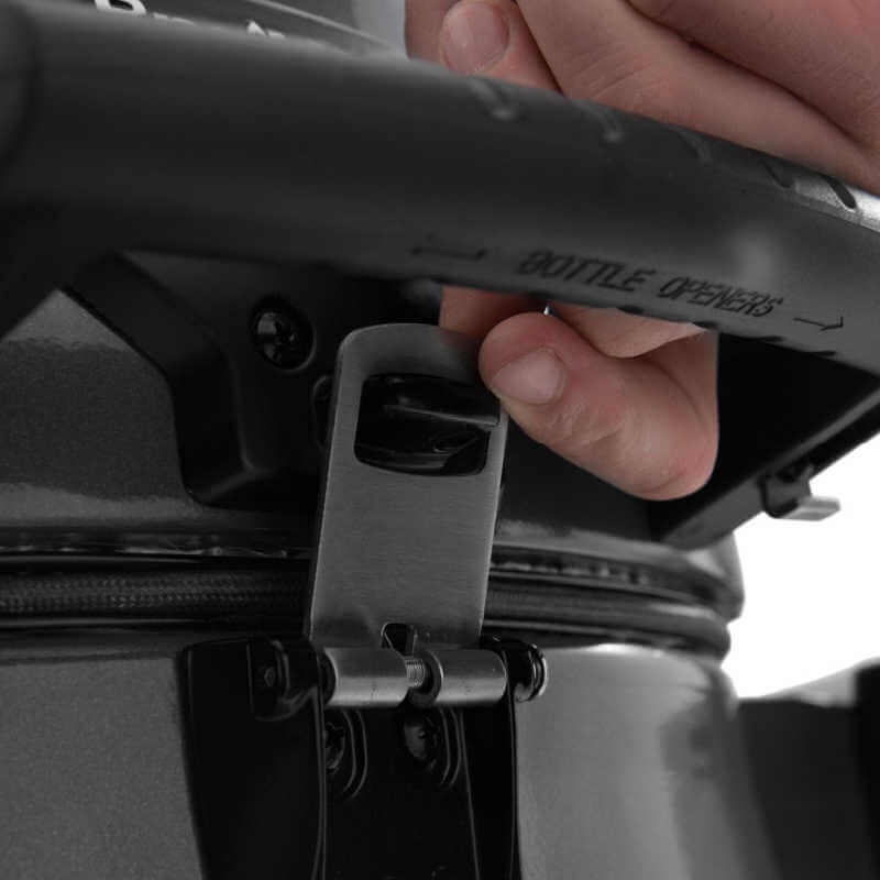 For added convenience, the Broil King Keg includes durable and removable resin side shelves for prep space, and cool-to-the-touch handles with an integrated bottle opener for enjoying a drink while you grill. The ultra-sturdy steel frame stand features heavy-duty wheels, making it easy to move the grill wherever needed. Additionally, the unique hitch adapter kit available for the Broken Keg allows you to take your grill on the road, perfect for tailgating or camping.