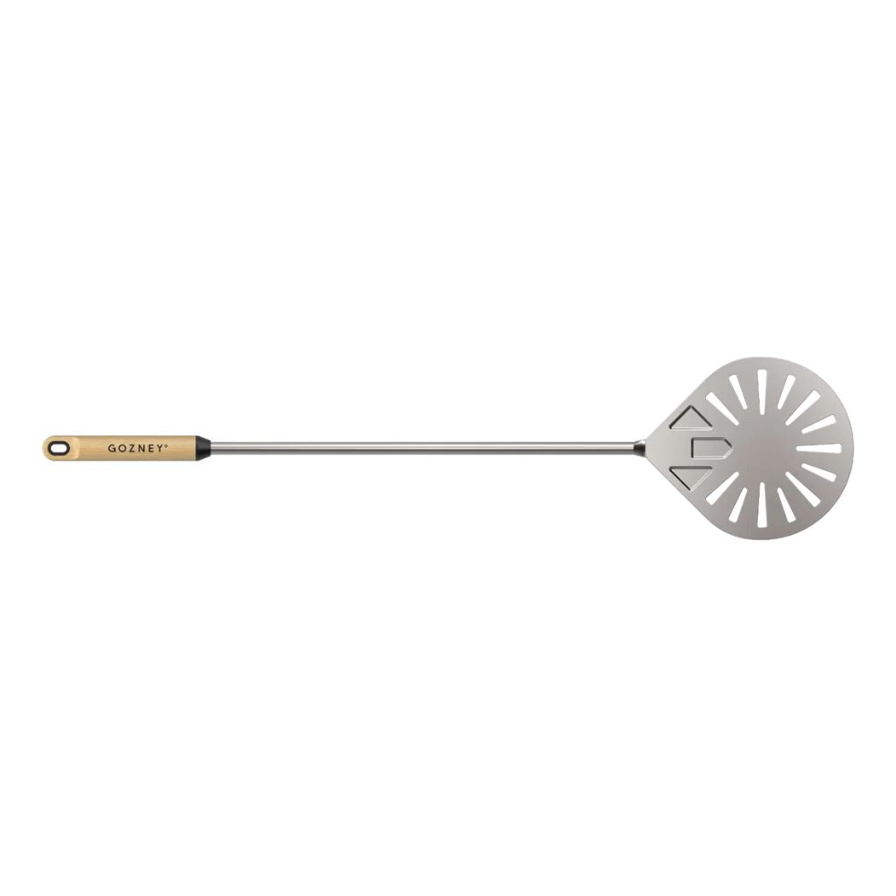 Next-level performance is effortless to handle with the Balance Turning Peel. Combining a larger aluminum blade with a comfortable Beech wood handle, this durable turning peel enables you to turn and move pizza with greater ease and control. The tear drop shape is designed to enhance the turning motion, with the entire blade being pressed and welded for a snag-free experience. The perforated metal lets excess flour fall through for delicious crust without the unwanted burnt taste. Designed to be ergonomic, the wood handle shifts the center of gravity closer to the hand for more control when moving pizza. The soft touch of the wooden handle is timeless and classic in its feel. Create pizza with confidence with the perfect balance of performance and ease.