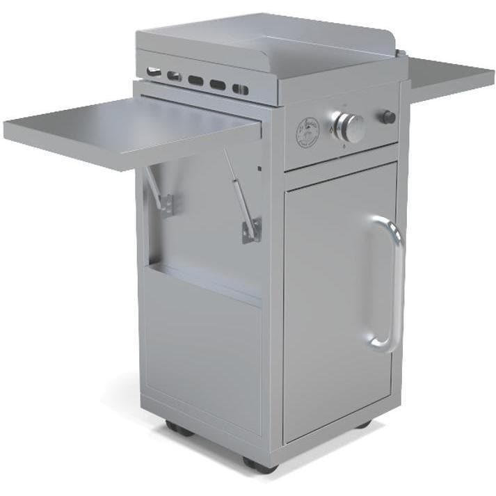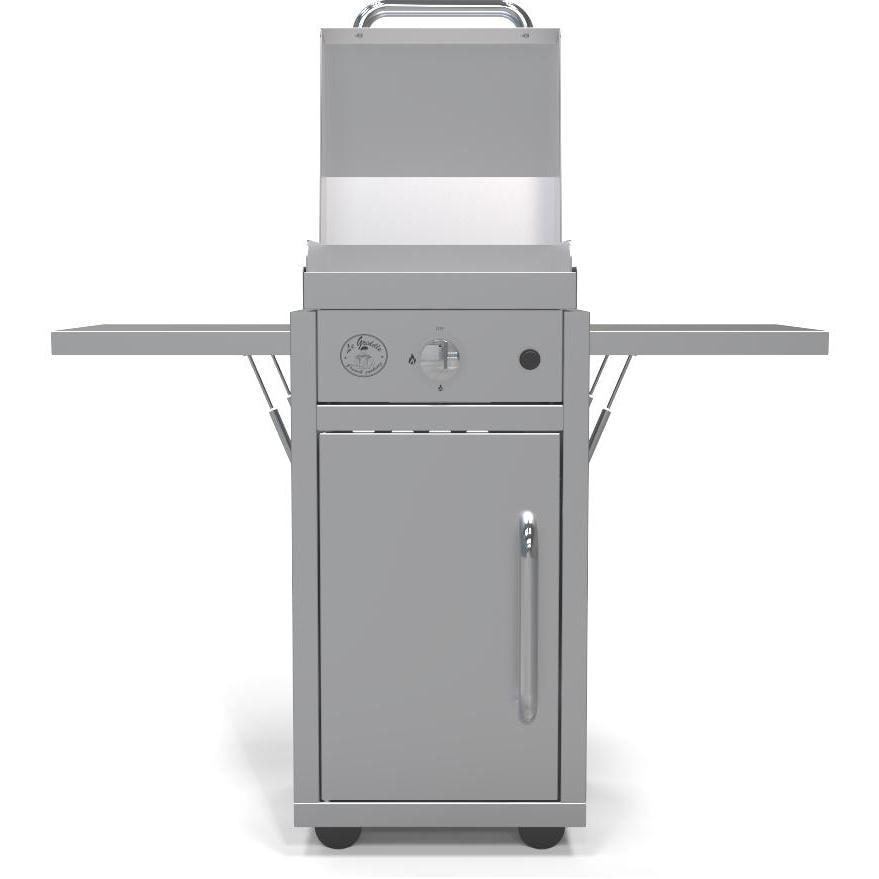 The Le Griddle propane gas griddle offers a healthy French-style cooking experience with its 16-inch professional-style 304 stainless steel griddle surface and components. The 1/2-inch thick enameled cast iron sub-plate provides excellent heat distribution, while the 304 stainless steel U-shaped burner supplies 9,000 BTUs of even heat. The push-button electronic ignition system is powered by a single AA battery, with a safety valve and thermocouple for automatic gas supply cutoff in case of a flame outage. Cleanup is easy with the removable griddle plate and grease collection tray. The portable stainless steel cart offers mobility with four locking caster wheels, two folding side shelves for extra prep space, and a secure storage area inside the cart with a propane tank holder. The Wee Griddle ships configured for propane gas and easily converts for natural gas use with the included conversion kit and instructions. A propane gas regulator or hose is not included, and a stainless steel lid is available separately. The Le Griddle Wee 16-Inch Freestanding Propane Gas Griddle will add style and cooking excellence to elevate your outdoor lifestyle. Command your backyard while entertaining your family and friends with a fresh cooked meal.