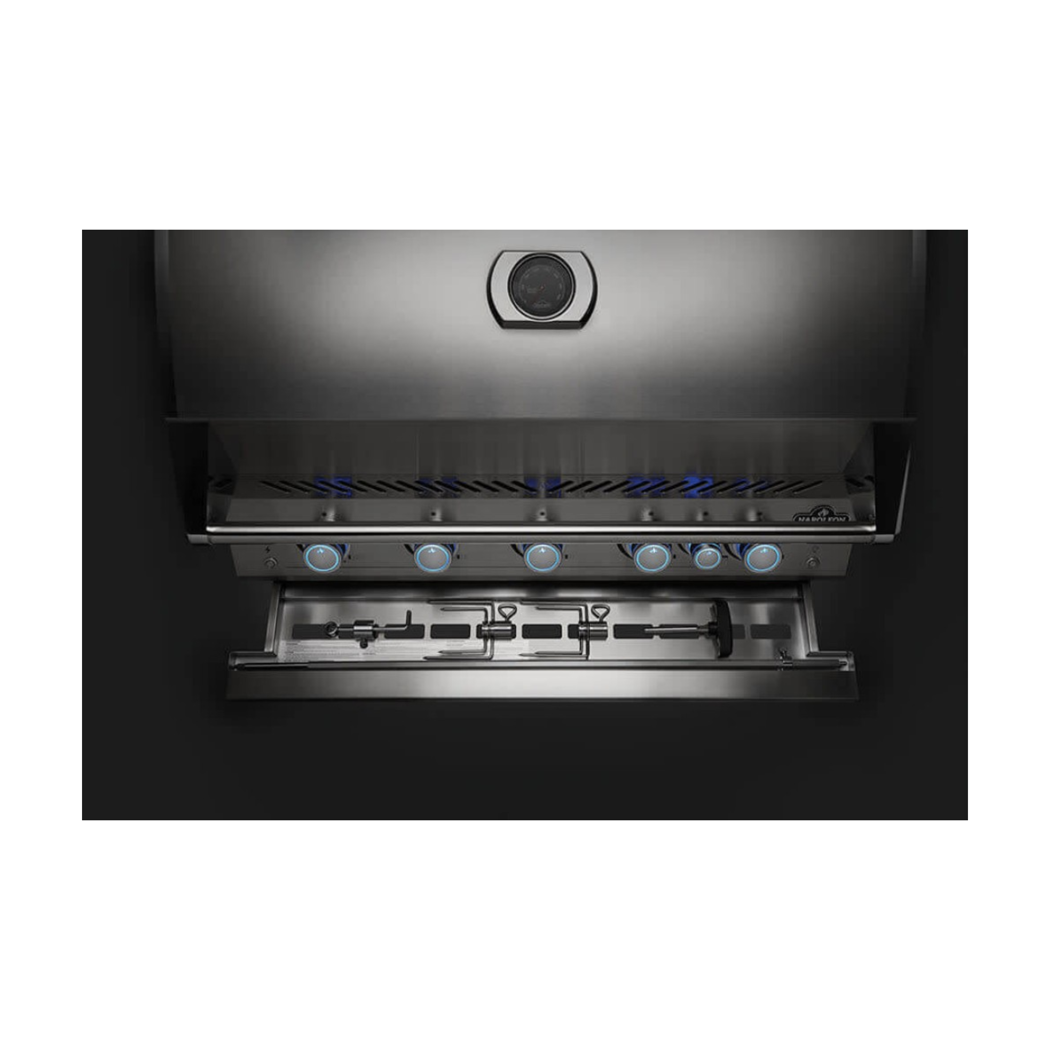- Safely and easily store the rotisserie kit inside the integrated rotisserie storage under the barbecue