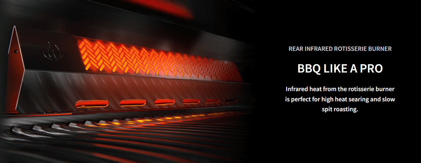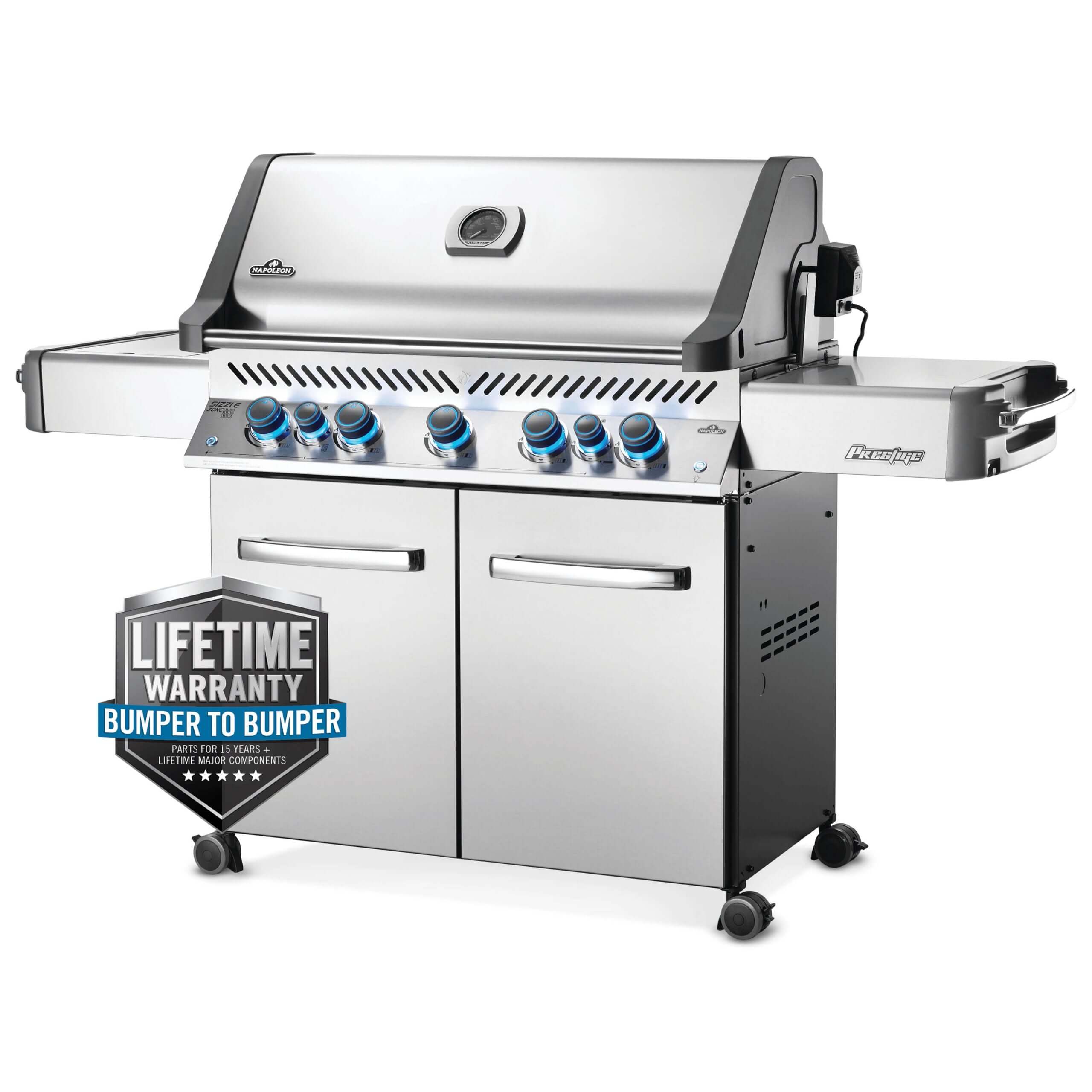 The Napoleon Prestige® 665 Propane Gas Grill with Infrared Side and Rear Burners is the total grilling package; with a stunning all stainless steel hood and stainless steel construction, this full sized cart model barbecue has the capabilities of a full outdoor kitchen. With five main burners, an infrared rear and side burner, this grill can cook meals using eight unique cooking styles. You’ll know it’s a Napoleon with the Iconic WAVEâ„¢ cooking grids for those distinctive sear marks. Not just durable on the outside; under the lid is the same quality stainless steel used for the tube burners, dual-level sear plates and cooking grids. The stainless steel sear plates provide extra surface area for any drippings from your food to vaporize, avoiding flare-ups. Never leave your barbecue on again as all the Prestige® series grills come with the SafetyGlow Feature where the control knobs glow red when the burner is on. Enjoy evenly cooked restuarant style meals with the rear infrared burner and rotisserie